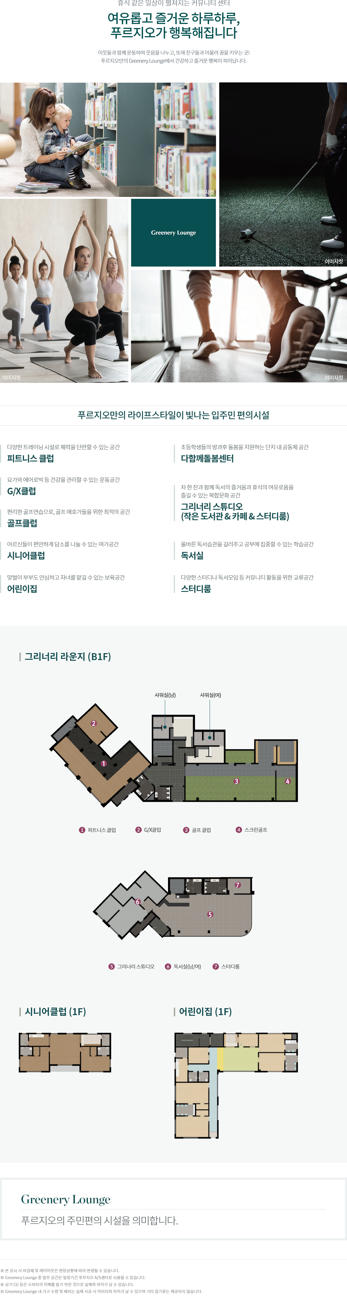 지상은 최소한의 차량 동선만 남기고 보행 중심으로 설계했습니다. 물놀이터와 그린스퀘어, 캠핑존, 단지 순환 산책로가 유기적으로 이어지며, 곳곳의 휴게 데크와 필로티 하부 커뮤니티가 그늘과 바람을 품습니다. 실내에는 피트니스·실내골프·그리너리 스튜디오, 어린이집·독서실·스터디룸 등 전 세대가 쓰기 좋은 시설을 배치했습니다. 퇴근 후 아이는 스터디룸에서 숙제를 마치고, 부모는 피트니스로 가벼운 운동을, 주말에는 캠핑존에서 간단한 브런치를 즐기는 장면이 자연스레 그려집니다. 이 ‘집 앞 10분 생활권’의 밀도가 광양 푸르지오 센터파크의 차별점입니다.