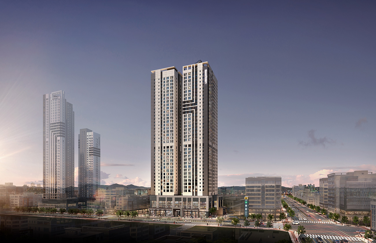 사업개요부터 정리해 보겠습니다. 대전 에테르 스위첸은 서구 용문동 594-6 일대에 지하 5층, 지상 38층 2개 동으로 조성되며 공동주택 138세대와 주거형 오피스텔 60실, 저층 근린생활시설을 품은 수직 복합 단지입니다. 대지면적 약 2,764㎡, 총연면적 약 3만9,651㎡ 규모에 건폐율 69%대, 용적률 약 999%의 도심형 스케일을 택했습니다. 주차는 총 258면으로 세대당 약 1.3대, 폭을 넉넉히 잡아 체감 편의가 좋습니다.