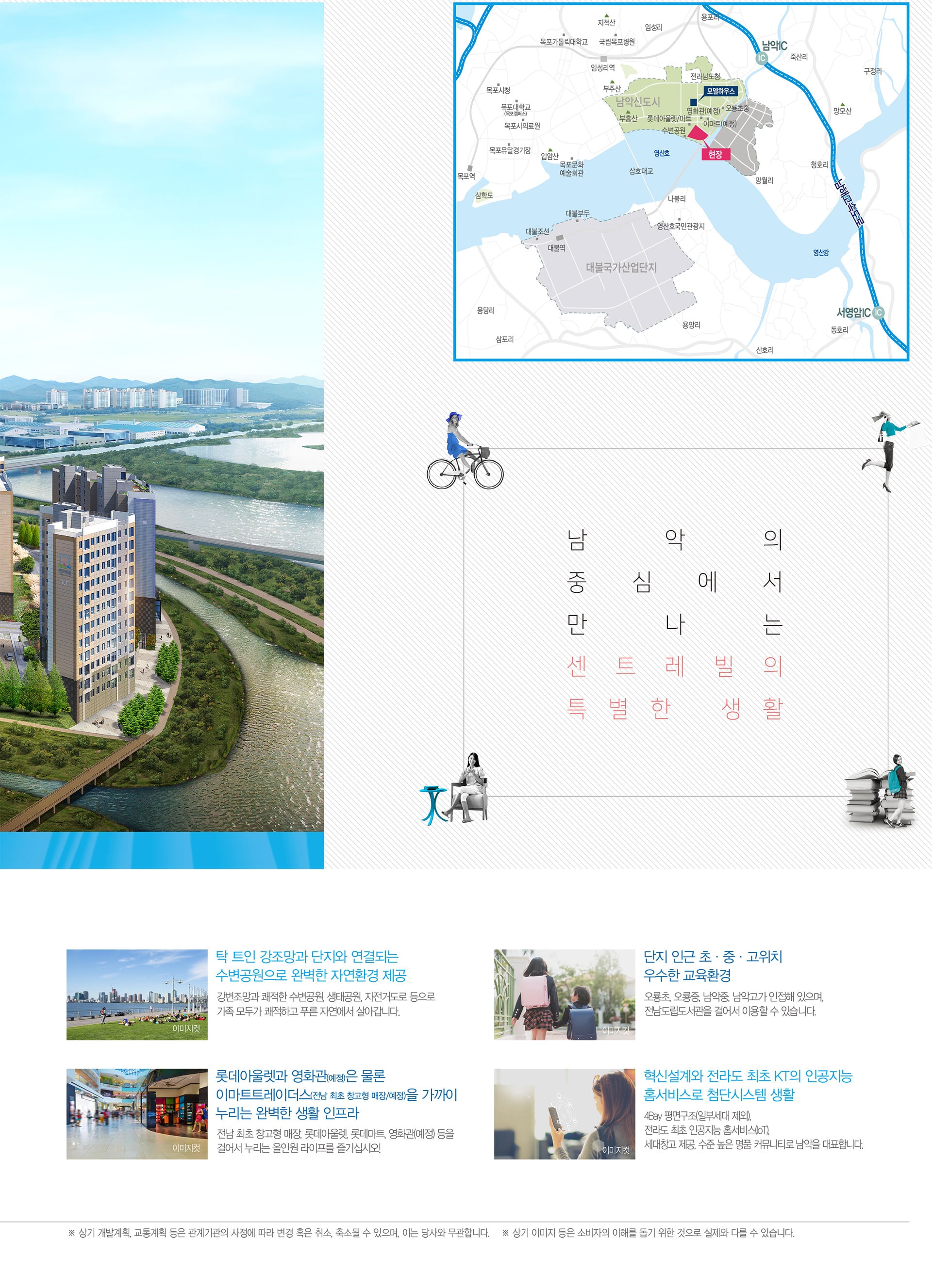 남악로·오룡남로, 남해고속도로 진입이 수월하고 삼호대교를 통해 대불국가산단 접근성이 좋습니다. 임성리역 이용도 가능해 광역 이동도 유연합니다. 롯데아울렛·대형마트(예정)·영화관(예정) 등 상업·문화 인프라가 풍부하며, 오룡초·중, 남악중·고 등 학군이 가깝고 학원가 이용도 편리합니다. 남악 센트레빌 리버파크가 남악 신도시의 중심축에 있다는 장점이 드러납니다.