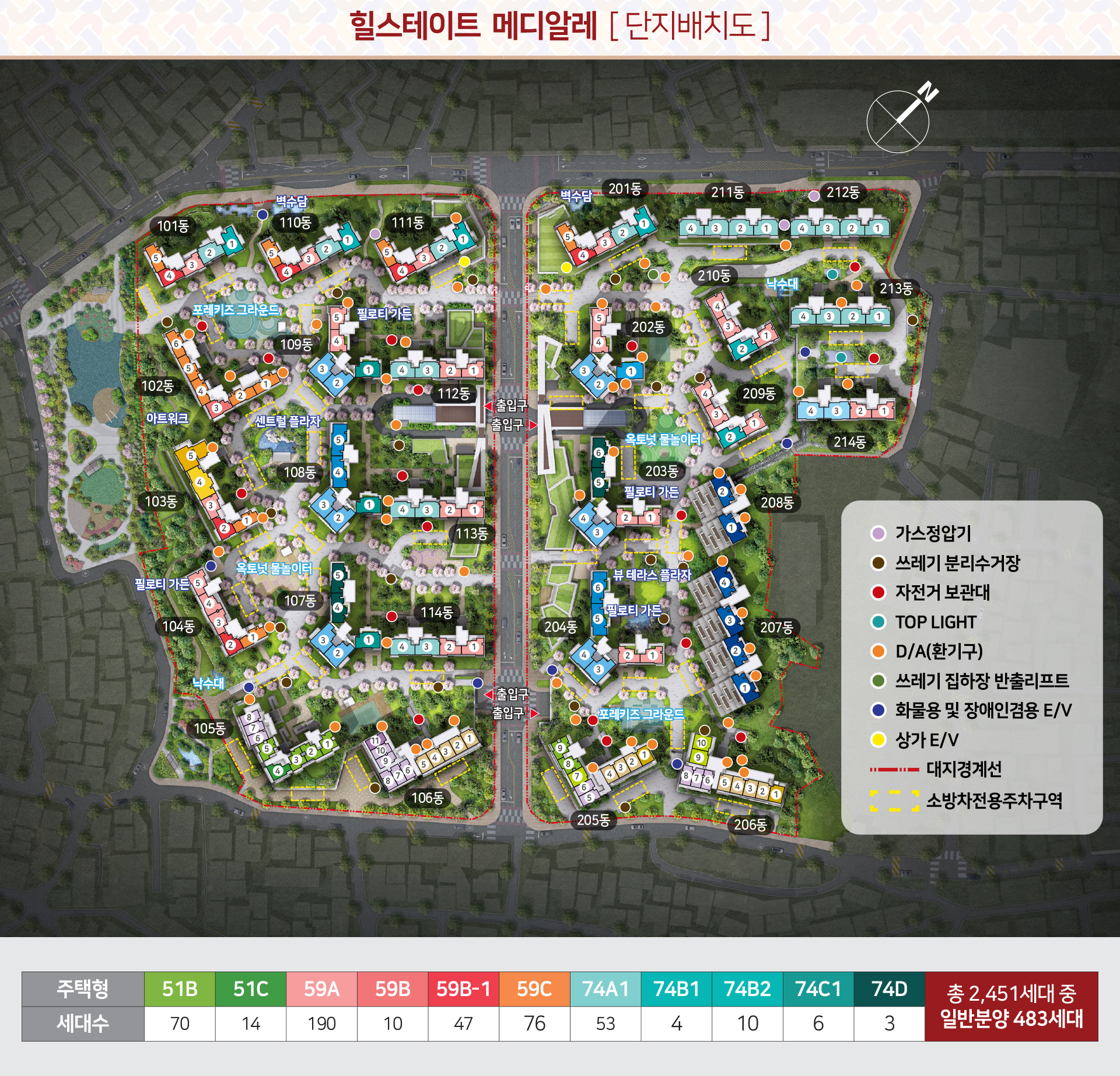 대조동 88·89번지 일대 재개발로 조성되는 힐스테이트 메디알레는 지하 4층 지상 25층, 28개 동, 2,451세대의 대단지입니다. 건폐율 24.88%, 용적률 243.48%로 도심형 밀도를 유지하면서도 개방감을 확보했고, 주차는 3,324대 규모로 가구당 약 1.35대 수준입니다.